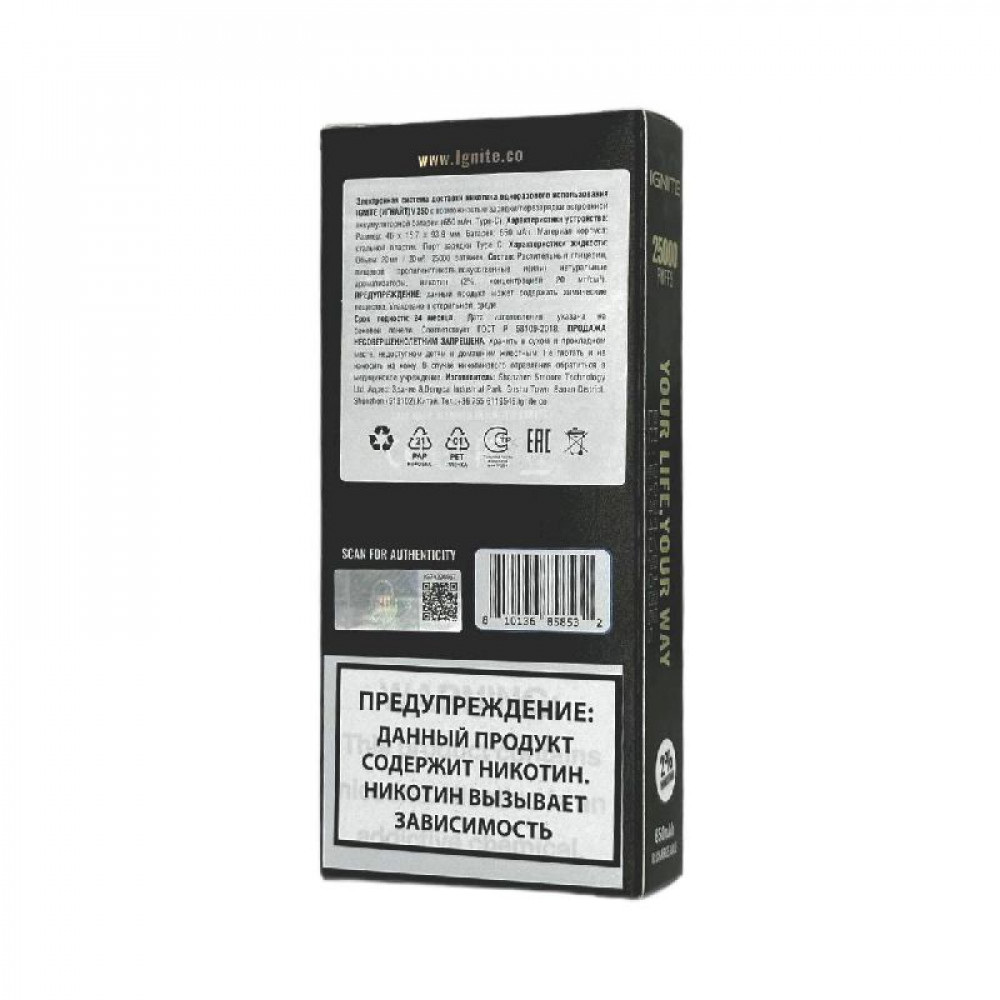 Технические характеристики Электронная сигарета Ignite V250 Gold 25000 - Minty Melon (Мятная дыня)